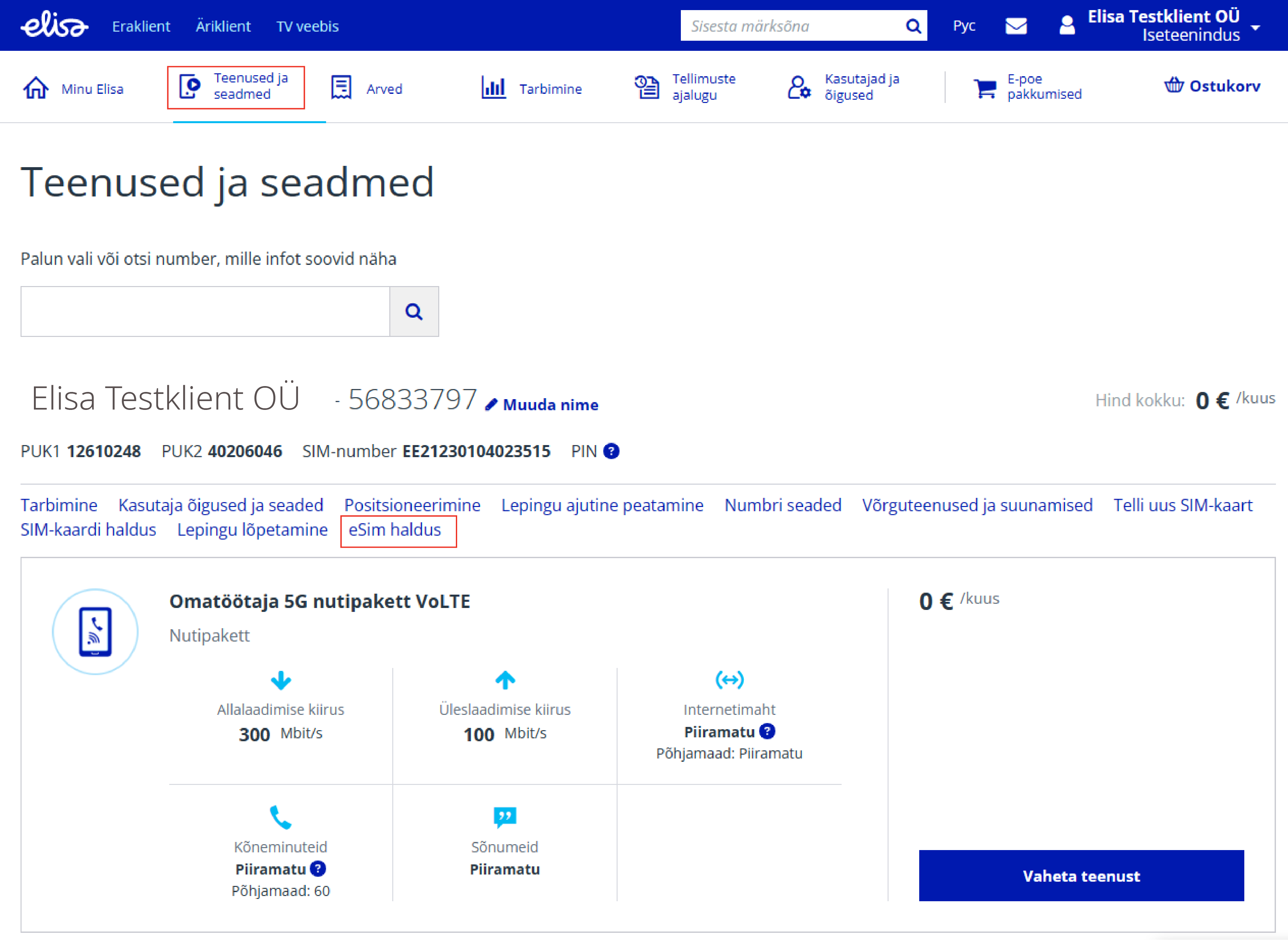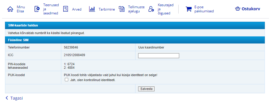 PIN- ja PUK-koodid leiate Elisa iseteenindusest. Selleks logige sisse Elisa iseteenindusse. Kui Teil on ligipääs mitmele kliendinumbrile, valige kliendinumber, mille alla kuuluva numbri PIN ja PUK-koode soovite vaadata. Valige peamenüüst „Teenused ja seadmed“. Valige mobiilinumber, mille SIM-kaardi koode soovite näha. Valige „SIM-kaardi haldus“. Oma SIM-kaardi PIN- ja PUK-koode saate vaadata ka SIM-kaardi ümbriselt. Uue PIN-koodi saate määrata siis, kui olete kolm korda järjest vale PIN-koodi sisestanud ja SIM-kaart lukustub. SIM-kaardi saate PUK1-koodi abil uuesti avada ja seejärel uue PIN-koodi määrata. SIM-kaardi PIN- ja PUK-koodid ning Mobiil-ID teenuse PIN- ja PUK-koodid on erinevad.eSIMi PIN- ja PUK-koodid leiate Elisa iseteenindusest. Selleks logige sisse Elisa iseteenindusse. Kui Teil on ligipääs mitmele kliendinumbrile, valige kliendinumber, mille alla kuuluva numbri eSIMi PIN ja PUK-koode soovite vaadata. Valige peamenüüst „Teenused ja seadmed“. Valige mobiilinumber, mille eSIMi koode soovite näha. Valige „eSim haldus“. Uue PIN-koodi saate määrata siis, kui olete kolm korda järjest vale PIN-koodi sisestanud ja eSIM lukustub. eSIMi saate PUK1-koodi abil uuesti avada ja seejärel uue PIN-koodi määrata. eSIMi PIN- ja PUK-koodid ning Mobiil-ID teenuse PIN- ja PUK-koodid on erinevad.